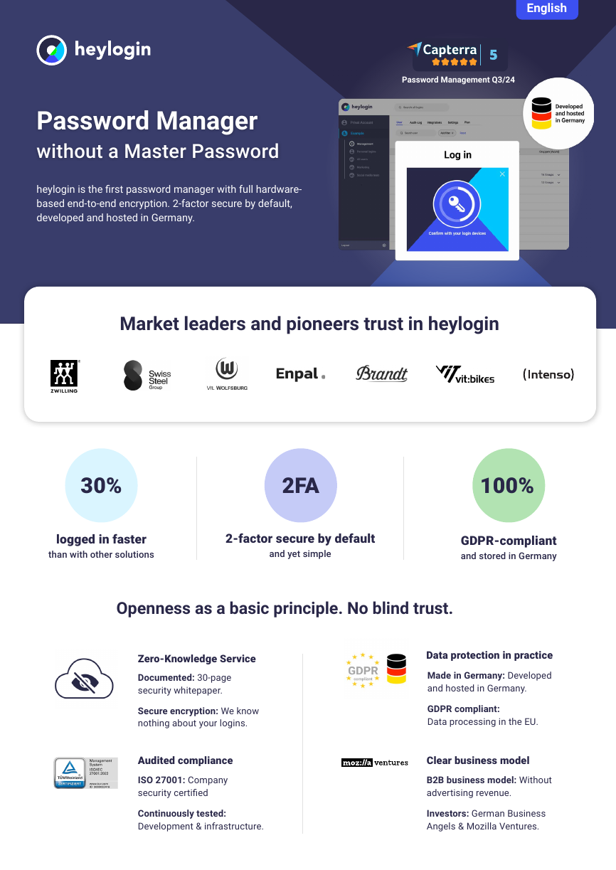 heylogin is the first password manager with full hardware-based end-to-end encryption. 2-factor secure by default, developed and hosted in Germany.